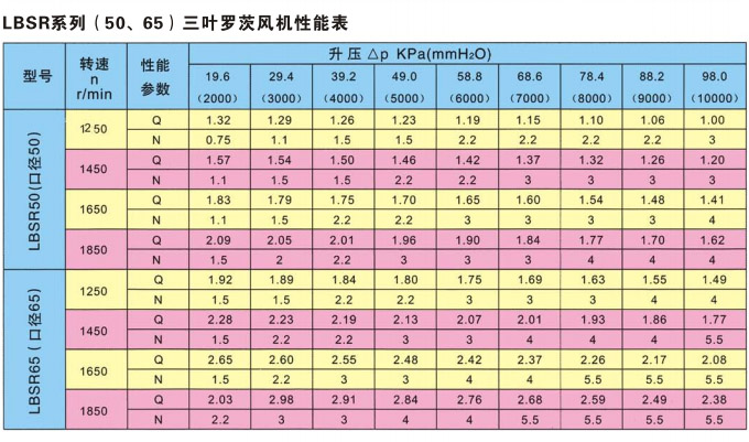 >> LBSR系列(50、65)三叶罗茨风机性能表