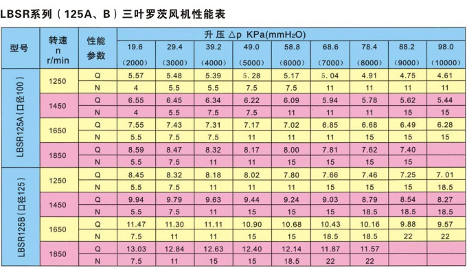 >> LBSR系列(125A、B)三叶罗茨风机性能表