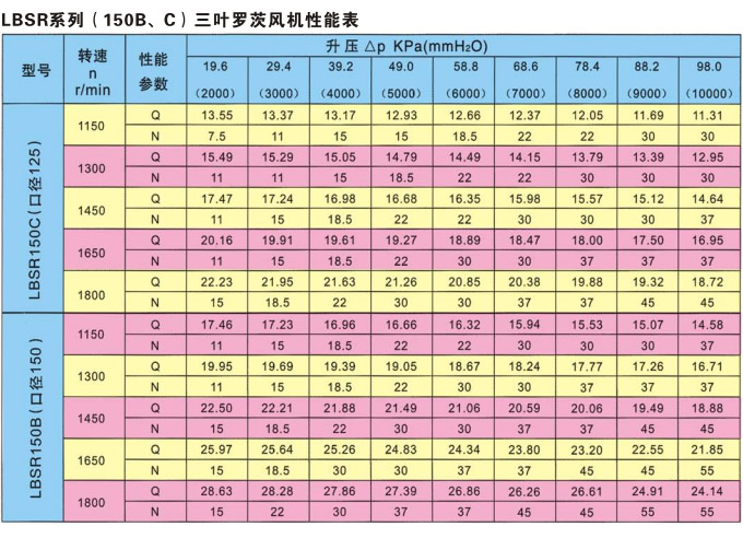 >> LBSR系列(150B、C)三叶罗茨风机性能表