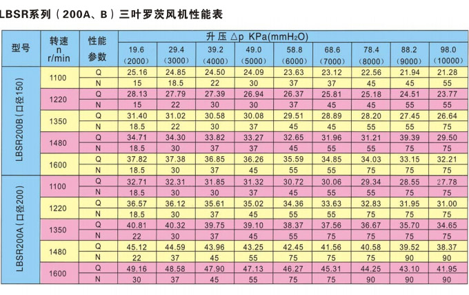 >> LBSR系列(200A、B)三叶罗茨风机性能表