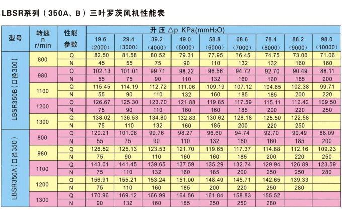 >> LBSR系列(350A、B)三叶罗茨风机性能表